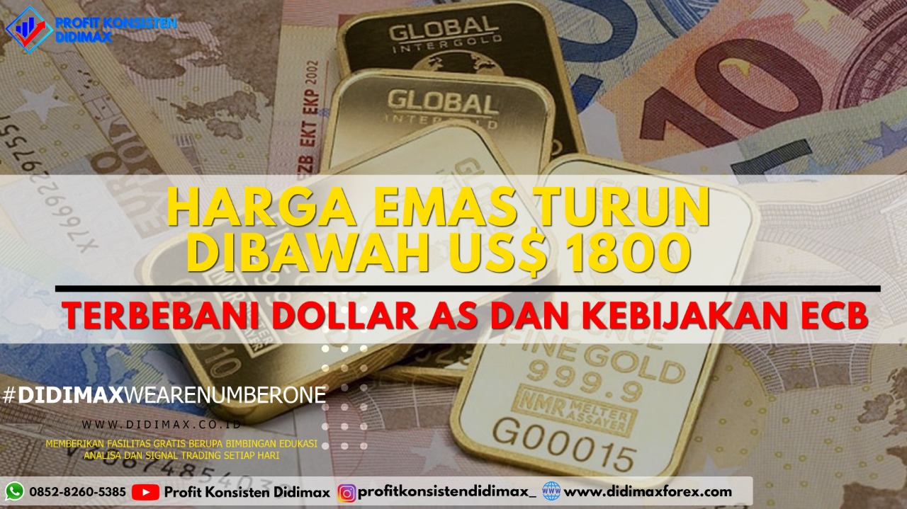 Pada perdagangan komoditas Harga emas turun di bawah level psikologis US$ 1.800 pada hari Kamis (16/7). Dilansir dari investasi.kontan.co.id lantaran dolar menguat dan Bank Sentral Eropa mempertahankan kebijakan moneternya, mendorong beberapa investor untuk mengunci keuntungan.